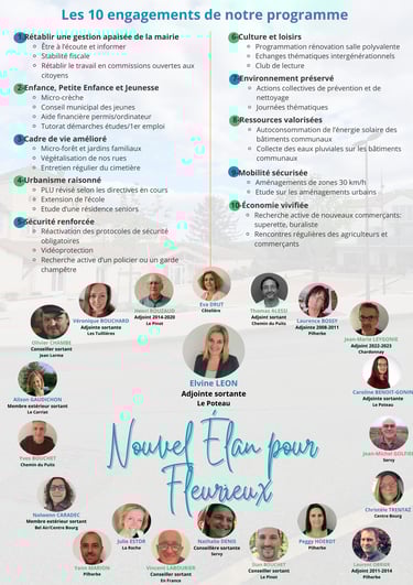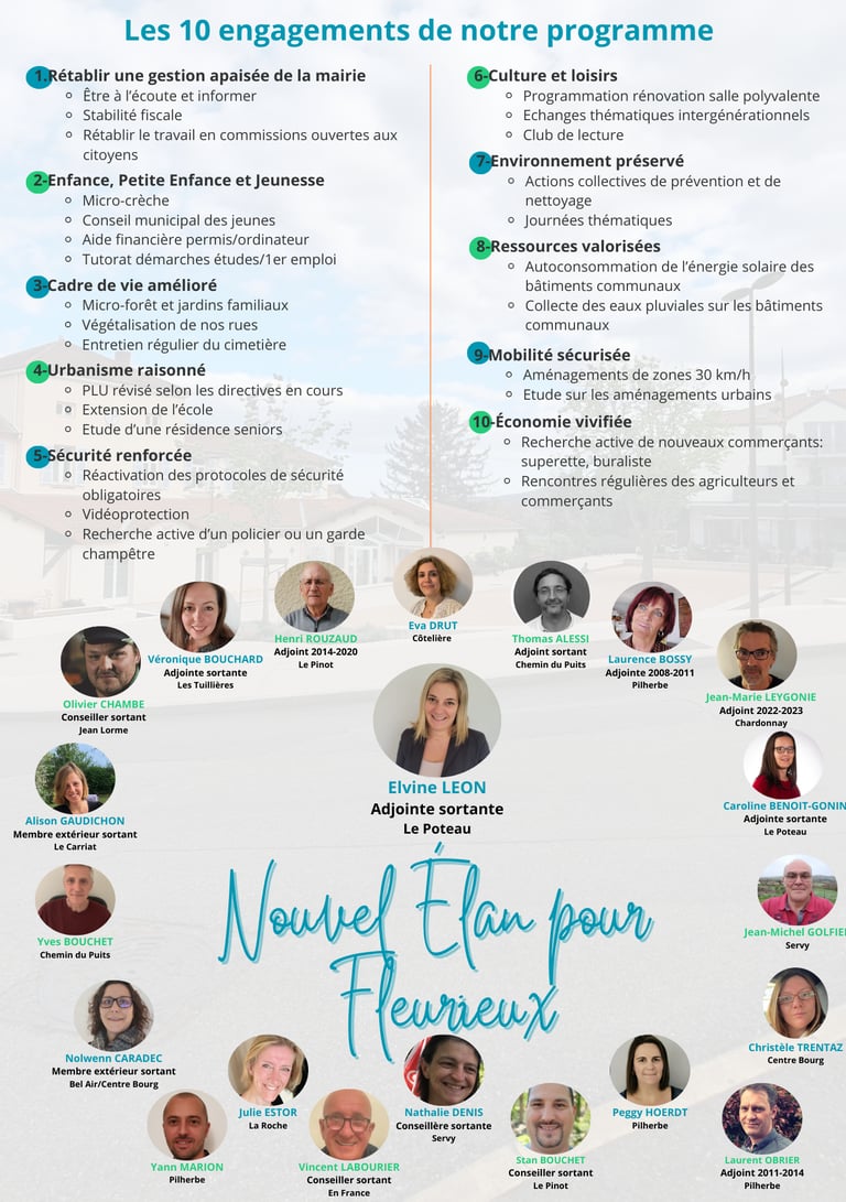 Rejoignez le mouvement d’union "Nouvel élan pour Fleurieux", une coalition dynamique de conseillers déterminés, d’adjoints engagés, d’élus expérimentés et de citoyens passionnés, tous unis pour un changement positif.